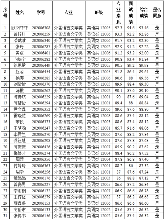 经过学生本人申请、学院资格审核、面试考查、综合成绩评定,现将我院2020级商务英语(卓越)班拟录取名单予以公示: