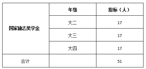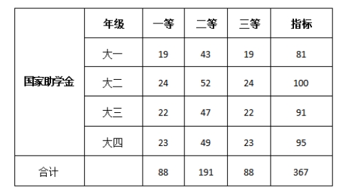 全院2021年国家励志奖学金资助总指标51人、国家助学金资助总指标367人,各年级具体分配名额如下: