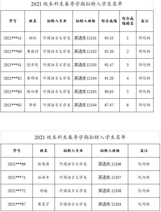 金年会诚信信誉至上2021级本科生春季学期转专业拟接收名单公示
