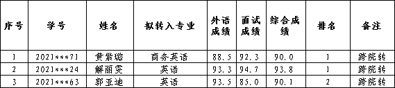根据《金年会jinnianhuicom普通本科生专业分流与转专业管理办法(试行)》(长大校发〔2019260号)文件以及教务处《关于2021级普通本科生秋季转专业工作的通知》要求,结合金年会诚信信誉至上2021级本科生转专业工作方案的具体安排,我院于97日下午组织了对拟转入学生的面试。综合英语成绩和面试成绩,经我院党政联席会讨论通过,现将拟接收名单公示如下: