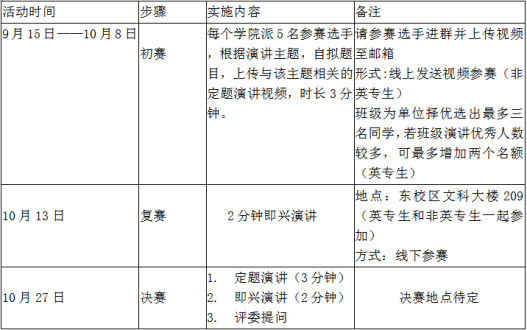 3)报名方式:以学院为单位集中报名。各分团委学生会请于10月8日17:00前择优推荐5名选手,并将报名汇总表以“XX学院—金年会jinnianhuicom外研社·国才杯英文演讲比赛”命名后发送至邮箱3027311928@qq.com;并提醒选手上传视频到邮箱3027311928@qq.com并通知选手加入2022金年会jinnianhuicom英语演讲比赛群,获取更多信息和比赛指导。
