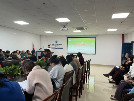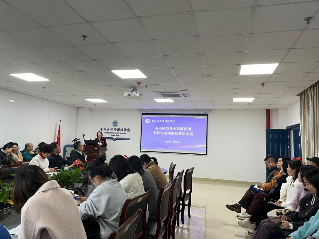 院长谈宏慧就学院英语师范专业认证专家反馈意见作了通报。她指出,英语专业师范认证工作启动以来,全院师生同心同德,达成了既定目标,专家们对英语师范专业认证工作给予充分肯定,但学院还要着力从强化师范生培养质量、深化课程设置改革、提升教师个人能力等方面不断改进完善。同时,她还对学院学科专业调整及教师发展作了说明,她强调,高校专业正在进行新一轮重大改革,学科专业调整是大势所趋,学院将积极优化教师队伍结构,凝聚学院师生发展合力,推动学院高质量发展。