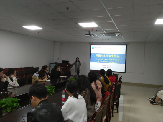 大学生就业问题一直是社会关注的热点话题,为了帮助金年会诚信信誉至上广大学子树立正确的就业观和择业观,了解就业过程中可能出现的问题,1022日晚上,金年会诚信信誉至上在文科大楼712会议室开展了主题为美国电子商务交流会——把握就业流程,注重就业信息收集与处理”就业指导系列讲座第一讲,讲座由美国硅谷穿业者田军女士主讲,2016级部分学生参加了本次讲座。