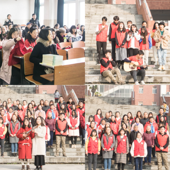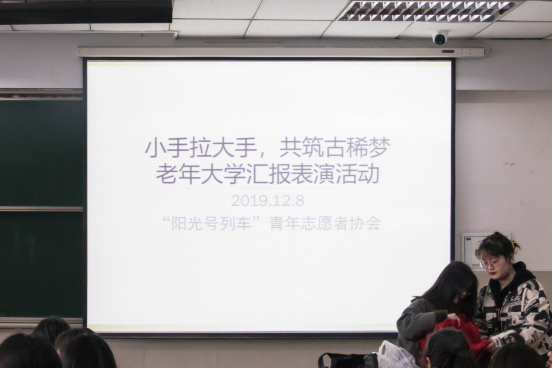 (摄/郑甜 罗娜 文/韩思洁 范期明为弘扬志愿者“奉献、有爱、互助、进步”的精神,同时向老人们传递关爱与温暖,12月8日上午九时三十分,我院阳光号列车全体成员在14教南小广场开展了主题为“小手拉大手,共筑古稀梦”的汇报表演活动。志愿者、老人们共同参与。