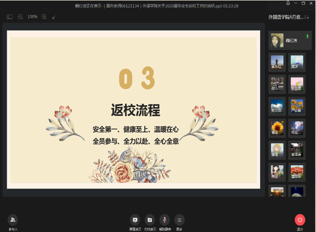 党委副书记魏红洁向大家详细讲解了《金年会诚信信誉至上2020届毕业生返校工作方案》。据统计,自6月15日至30日,我院共有318名毕业生获得批准返校。为热情、周到、安全、有序做好我院毕业生返校相关工作,学院成立了毕业生返校办理毕业手续工作领导小组,由院党委书记和院长担任组长;制定了详细的毕业生返校流程,每一名毕业生返校都安排有联系人,联系人均由学院教师和学生志愿者担任。魏红洁副书记号召全院教职工积极主动参与到毕业生返校工作中来,让学生高兴而来,满意而归。