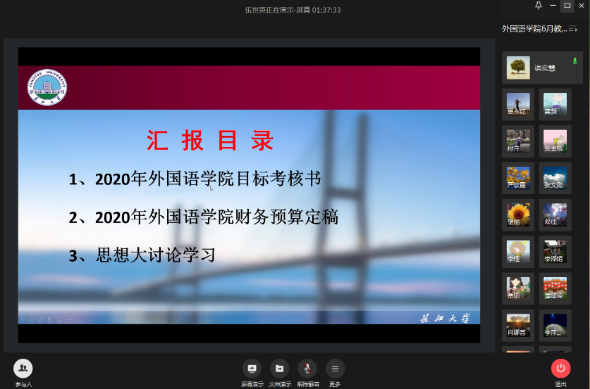 最后,院长谈宏慧向大家讲解了学院与学校签字的《2020年金年会诚信信誉至上目标考核书》主要考核指标情况;对学院2020年的财务预算进行了讲解和说明;对学校要求组织开展的“金年会jinnianhuicom办学思想大讨论”进行了安排部署,6月21日前以系(部、室)为单位组织开展讨论,6月23日学院组织集中研讨交流,各系(部、室)选派代表进行交流发言。她希望全院教职工积极参与到办学思想的讨论中来,主动为学院“十四五”规划的制定建言献策,促进学院健康稳定发展。