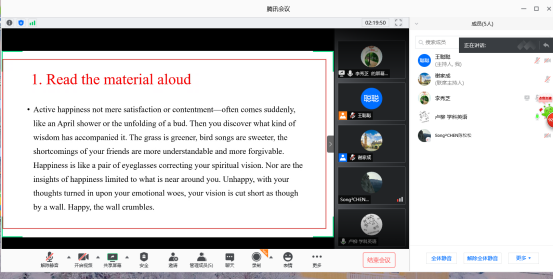 下午,营员们首先根据专业分组进行了自我介绍和才艺展示,加深了导师和同学们相互之间的了解。之后,针对不同学位点的特色,导师们还分组进行了有针对性的“云考核”,如对拟报考学术型学生要求阅读国外期刊论文并进行综述与评论写作,对拟报考翻译硕士学生要求完成英汉互译,对拟报考学科英语的学生要求当场完成英语语篇朗读及回答问题以及命题写作等。