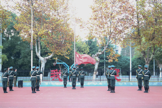 仪式开始前,在主持人的引导下,全体同学朗诵《感谢有你》——致敬每一个中国人,7点整,升旗仪式准时开始。国旗护卫队庄严而有力的步伐踏向升旗台,国歌声缓缓响起,全场肃穆,全体师生注视着空中飘扬的五星红旗。