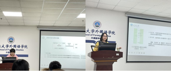 随后,周玲同学为大家带来了主题为“译者与翻译生态环境——以杨宪益《儒林外史》英译本为例”的汇报。她的汇报从生态翻译学发展历程、译本选择及研究问题、案例分析、结论与启示四个方面入手,运用译者主体理论、多维转换理论研究译者有意识的翻译行为。