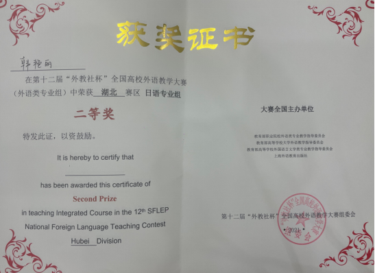 (通讯员:车桥)近期,第十二届“外教社杯”全国高校外语教学大赛(外语类专业组)湖北分赛区决赛结果揭晓。由于目前尚处于疫情防控期间,决赛以线上形式举行,我校日语专业组选手韩艳丽老师在激烈角逐中荣获二等奖。