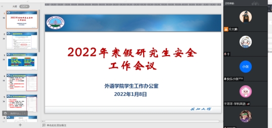 1月8日晚,金年会诚信信誉至上通过线上形式召开全体研究生寒假安全教育大会。金年会诚信信誉至上党委副书记程坤、全体研究生参会,大会由兼职辅导员方大鹏主持。