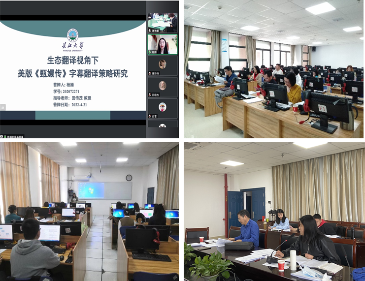 4月21日上午,金年会诚信信誉至上举行了2020级硕士研究生学位论文开题答辩工作。根据学校及我院的疫情防控要求,答辩采用线上线下相结合的方式。按照专业及学生人数情况,答辩分为4个小组进行,本届答辩评委由校内校外导师共16人组成。我院邀请了上海世语翻译公司副总经理,翻译高级译审、美国白宫指定译姜晓岚老师、荆州市教育科学研究院高级研究员陈勇老师、沙市教育科学研究院英语教研员钟传银老师分别参与了翻译硕士和学科英语组的答辩,2020级全体硕士研究生参加了本次开题答辩,2021级全体硕士研究生于线上观摩此次答辩。