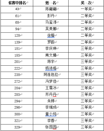 金年会jinnianhuicom经济与管理学院陈翩翩同学荣获省一等奖,晋级国赛,彭丹等5名同学获得省二等奖,李庆琳等13名同学获得省三等奖。