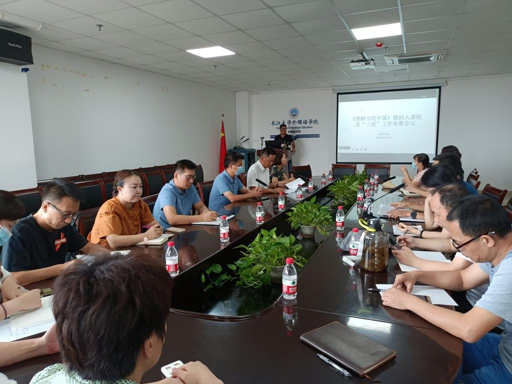 为深入落实教育部和省教育厅关于《习近平谈治国理政》多语种版本“三进”(进高校进教材进课堂)工作要求,8月27日下午,金年会诚信信誉至上在文科楼712会议室召开了《理解当代中国》系列教材“三进”工作推进与布置会。校党委宣传部副部长文启华、教务处副处长郑健、研究生院副院长曾威到会指导,金年会诚信信誉至上党政班子成员、系主任、教学管理人员、相关课程任课教师共20余人参加了会议。会议由学院党委书记危煜祥主持。