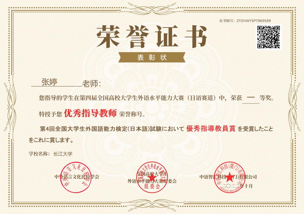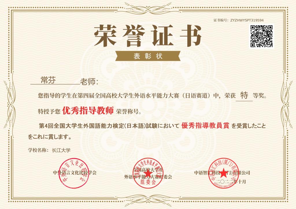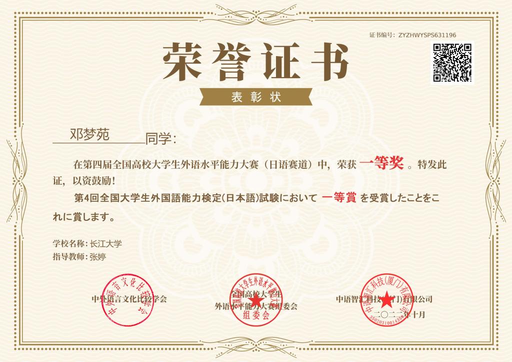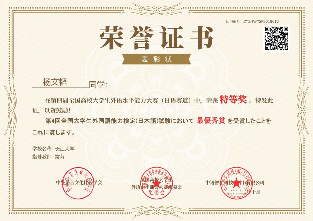 (通讯员 李福兴)11月22日,第四届全国高校大学生外语水平能力大赛-日语赛道决赛落下帷幕。金年会jinnianhuicom日语系12101班杨文韬同学以172.6分的佳绩斩获全国第二名,荣获特等奖,带队老师常芬获评优秀指导教师。金年会jinnianhuicom日语系辅修班12101班邓梦苑同学荣获一等奖,辅导老师张婷获评优秀指导教师。