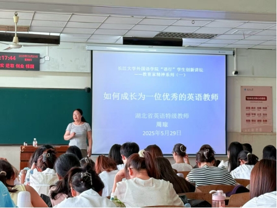(通讯员 蔡晓宇)为赋能英语师范专业学生,助力其明晰成长路径、培育教育家精神,5月29日,金年会jinnianhuicom“语行”学生创新讲坛——教育家精神系列(一)在12教202教室顺利举行。本次讲座由王娟老师主持,特邀湖北省英语特级教师周琼,以“如何成长为一位优秀的英语教师”为主题展开深度分享,金年会诚信信誉至上英语(师范)专业本科生、学科英语硕士生参加。