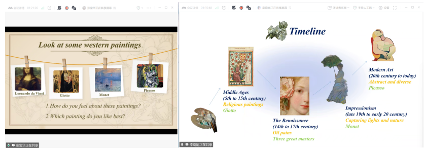 张宝华与李晓娟两位同学围绕高中选修三Unit 1“A Short History of Western Painting”这一课题,分别进行了读思课的同课异构教学展示。荆南中学王莉老师对两节课进行了专业点评。王老师充分肯定了两位同学在教学设计和实际展示中的优异表现,特别指出课程环节完整、层次清晰、重点突出。她表扬张宝华在读后问题设计上富有创意,也称赞李晓娟的课堂呈现近乎完美。同时,王老师也从单词发音的准确性和教学环节之间的衔接流畅度两方面,提出了具有针对性的提升建议。
