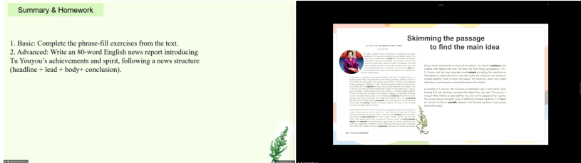 潘美琪与叶淑慧两位同学围绕高中必修二Unit 3“Stronger Together: How We Have Been Changed By The Internet”这一课题,分别进行了读思课的同课异构教学展示。洪湖一中的唐甜老师对两节课作了专业点评。唐老师充分肯定了两位同学在教学环节的完整性、课堂互动的有效性以及课前准备的充分性等方面的表现。同时,她也从多个维度提出了宝贵的改进建议,包括导入环节的优化、学生互动的深入引导、PPT呈现的精炼增强,以及问题设置的层次提升。唐老师特别强调,本节课可在最后增加课程思政的升华部分,将互联网发展与社会责任、集体精神等价值理念有机结合,实现立德树人的教学立意。