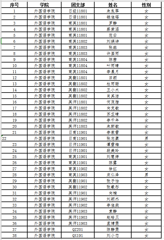 根据《共青团推优入党工作实施办法(试行)》(中青发〔2019〕9号)、《共青团金年会jinnianhuicom委员会推优工作实施细则》(长大团发〔2017〕8号)文件精神,经各班团支部大会推优投票表决、院团委审核,报外语学院党委审查同意,2021年上半年(非毕业年级)团内“推优”为发展对象的名单公示如下: