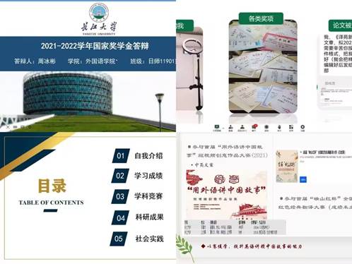 在本次答辩中,十名候选人分别从自我介绍、学习成绩、学科竞赛、科研成果、社会实践五个方面进行ppt展示和答辩,同时也表达了自已经历大学生活后的感受以及对未来的展望。经过评委投票,周冰彬、张曦彤、薛梦哲等三名同学获得国家奖学金推荐资格。