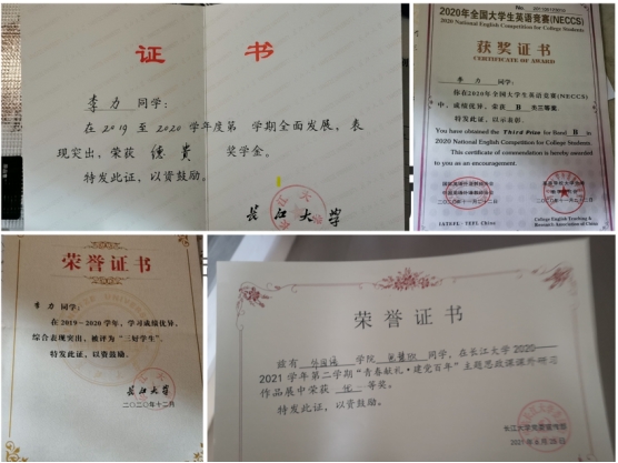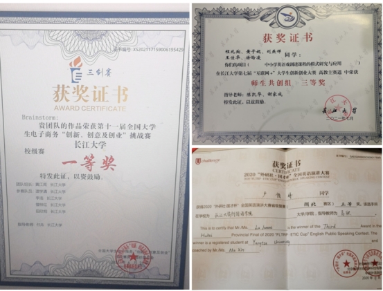 我们奋发图强,事事争先,着眼远方,不因眼前的小小成绩而自满,不忘把知识能力运用到各种学科竞赛中。2020年11月,卢俊炜同学在2020 “外研社· 国才杯”校园辩论赛中荣获一等奖,在2020“外研社·国才杯”全国英语演讲大赛省级复赛湖北赛区中荣获三等奖。2021年6月,以黄江闻同学为组长的团队在第十一届全国大学生电子商务“创新、创意及创业”挑战赛金年会jinnianhuicom校级赛中荣获一等奖。2021年7月,王佳华、徐晗凌同学在金年会jinnianhuicom第七届“互联网+”大学生创新创业大赛 高校主赛道中荣获师生共创组 三等奖。同学们的共同努力为这个大家庭迎来了一个又一个里程碑的时刻,他们的知识在刻苦勤奋下日益增长,同时他们卓越的学习精神将陪伴他们一生,使他们在未来发展为企业的精英,社会的顶梁柱。