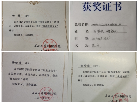 在大学的象牙塔里,努力学习专业知识和各类文化的同时,我们在一项又一项的课余活动中取得了可人的喜果。同学们热爱外院的阳光文化,积极参与阳光文化节的活动。其中,王佳华、徐晗凌、向楠、郭兴宇、付文雨等同学被评为金年会诚信信誉至上第十五届“阳光文化节”活动积极分子,其中王佳华、徐晗凌同学获得“优秀演员”称号。在开展红歌大合唱排练活动时,班上所有同学积极参与此次演唱并表现优秀。褚金帆同学在2020年金年会jinnianhuicom体育舞蹈比赛中获得双人拉丁组第二名。丰富多彩的课外活动,既增强了班级的凝聚力,又使同学们在紧张的学习生活之余得到调节。