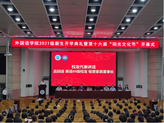 9月22日晚,金年会诚信信誉至上英语专业89级校友、东莞铭晋家具有限公司董事长吕邱进应邀出席学院2021级新生开学典礼暨第十六届“阳光文化节”开幕式。作为校友代表,他通过自己的求学和创业经历,分享了他的人生感悟,对学弟学妹们提出了希望与期待。