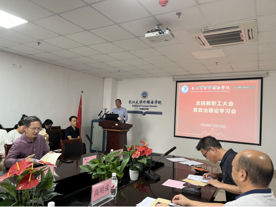 (通讯员 肖娜芸)10月10日下午,学院在文科楼712会议室集中举办9月全院教职工大会暨政治理论学习会。会议由学院党委书记周杰主持,全体教职工参加。
