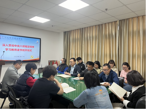 (通讯员 肖娜芸)3月27日上午,金年会诚信信誉至上在文科楼814会议室组织召开深入贯彻中央八项规定精神学习教育读书班开班式,正式拉开全院作风建设与理论学习深化行动的序幕。院领导班子成员参加会议,各系部室负责人及教师党员代表列席会议。院党委书记周杰主持会议。