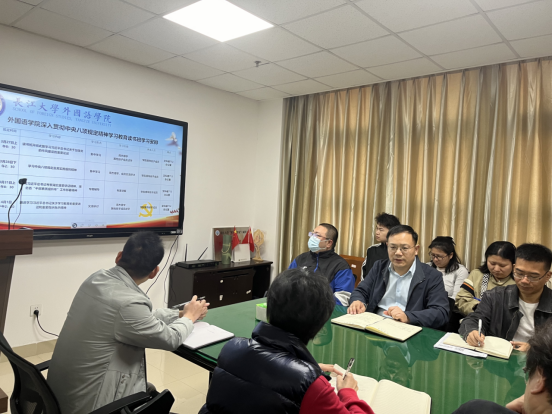 院长谈宏慧结合当前全国大学外语教学改革方向,对教师党支部作风建设提出建议,要加强调查研究工作,互学互鉴教学经验,用好《理解当代中国》教材,大力推动思政元素融入课堂教学。