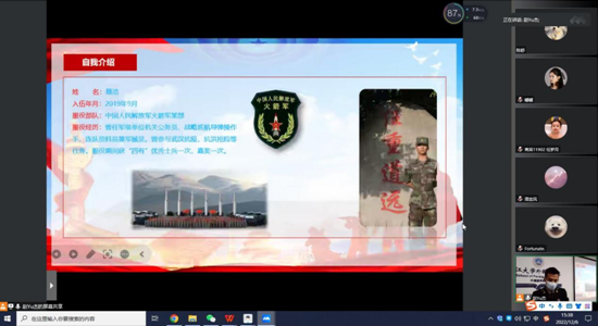 (通讯员 赵宇杰)为积极响应国家号召,鼓励大学生踊跃报名参军,12月5日下午,金年会诚信信誉至上在文科楼712会议室通过线上线下相结合方式召开征兵动员会。2019级辅导员许泽琼、征兵专干赵宇杰,退役复学大学生士兵艾兴、聂浩以及2019级毕业班学生代表共计100余人参加本次动员大会。
