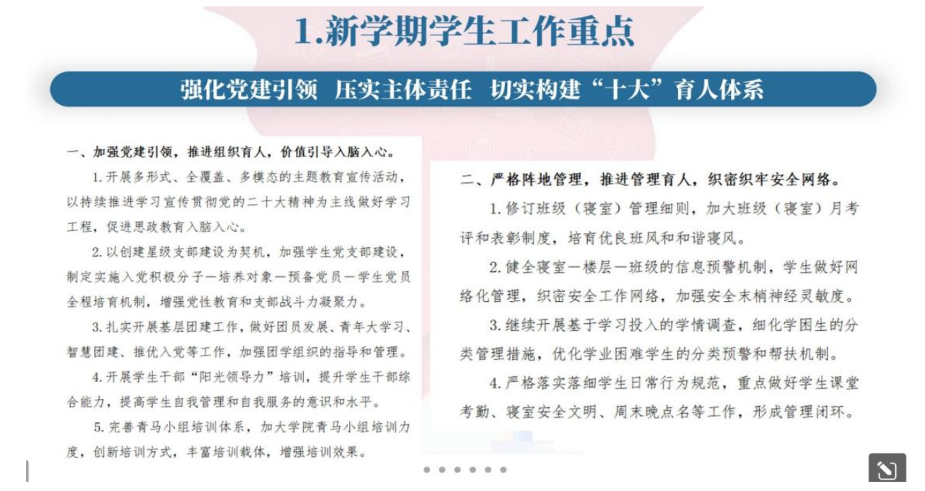 2月5日-7日,各年级分别召开学生骨干会议,会议由各年级辅导员主持和主讲,年级班委、寝室长、楼栋长和其它学生干部参会。会上,辅导员首先对新学期学生工作重点进行解读,要求学生干部发挥好示范引领作用,强调学生干部的担当精神和责任意识;其次对开学前学生干部的工作内容开展教育培训,鼓励学生干部充分发挥朋辈育人作用,关心关爱周围同学,凝聚全院学生以积极的心态迎接新学期的来临。