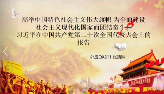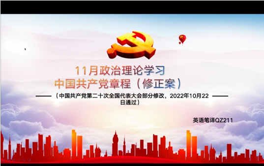 会上,外国语言学及应用语言学21级研究生张靖琳带领大学学习了习近平总书记在中国共产党第二十次全国代表大会上的报告;英语笔译21级研究生吴珺汇报了学习《中国共产党章程(修正案)》的体会,让大家进一步了解了党章的制定及其修订过程;学科英语22级研究生程丰娟带领大家学习了十九届中央纪律检查委员会向中国共产党第二十次全国代表大会的工作报告,强调党员要严格遵守党的纪律和党章,坚持以身作则;英语笔译22级研究生焦倩倩带领大家学习了习近平总书记在党的二十大闭幕会上的重要讲话精神,倡议大家认真学习领会习近平总书记的讲话精神,为实现中华民族伟大复兴中国梦而不懈奋斗。学科英语21级研究生冷依萍传达了《中共中央关于认真学习宣传贯彻党的二十大精神的决定》文件。