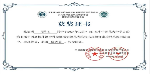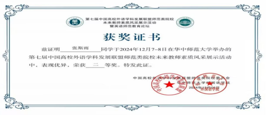 (通讯员 张斯雨)为全面提升师范类院校学生英语教学技能和教学水平,推动未来卓越英语教师综合素养的培养,发挥职前教师教育的引领示范作用,由中国高校外语学科发展联盟主办,华中师范大学承办的“第七届中国高校外语学科发展联盟师范类院校未来教师素质风采展示活动”,于12月8日成功落下帷幕。在此次盛会中,金年会诚信信誉至上鲁志荣老师悉心指导的22级学生张斯雨同学荣获二等奖、肖贻之同学荣获优秀奖,展现了我院学子的卓越风采。