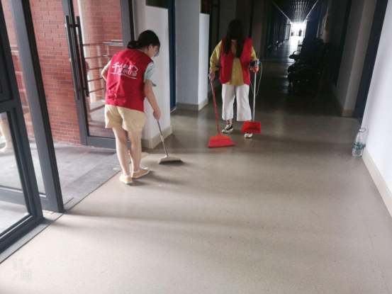 活动开始,为提高效率,不拖沓,爱创自强社成员将7人分成2个小分队,分别从1楼开始向上清扫和11楼向下清扫。志愿者们打扫认真而仔细,不留一丝灰尘,地面像是被志愿者们装饰了一番。在文科大楼校史走廊,大楼安保室员工为志愿者们点赞,道上人来人往,有走路声,读书声,但不变的是志愿者们一颗无私奉献,勤勤恳恳的爱心。