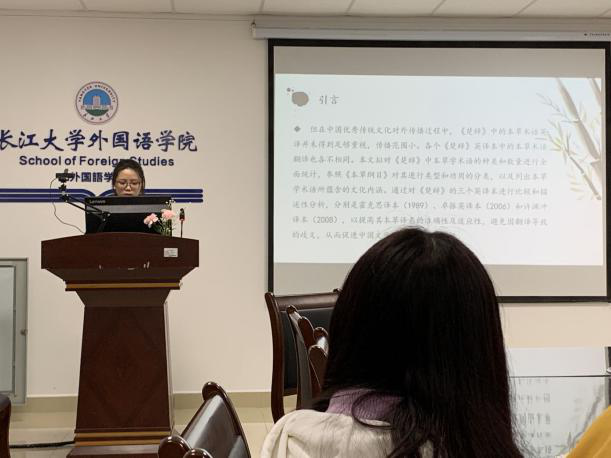 首先由陈楠同学为大家做了汇报,她的汇报主题是:《楚辞》中本草学术语的翻译方法初探。她的研究主要内容是对《楚辞》的三个译本进行比较和描述性分析,研究目的是提高本草译名的准确性及适应性,避免翻译时的歧义,从而促进中国文化典籍在海外的传播。首先,她依据《本草纲目》对本草术语进行了分类,介绍了《楚辞》中植物文化产生的基础,总结出四条翻译方法与四个翻译原则,意在通过研究实现植物学知识与楚文化人文知识的共享与互动,为文化典籍术语英译提供借鉴。第二位主讲人高宁的报告主题是:生态翻译学下韦利《国殇》重译动因研究。首先,高宁对生物翻译学做了简单的介绍。而后,她将韦利《国殇》的两个译本从相同点和不同点两个角度进行了对比。最后,她表明韦利选择重译是基于翻译生态环境的变化以及翻译群落的变化。她认为,典籍重译动因可以从译者和读者所处的社会现状与社会意识形态以及译者的翻译兴趣和选择等方面考虑。汇报结束后,同学们积极提问,两位主讲人也对大家的疑问做出了详细的解答。