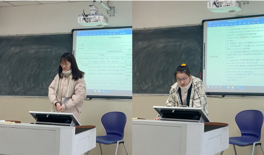 首先,谢家成教授向大家解释了文本解读在英语教学中的意义,并对学科英语方向研究生如何提高文本解读能力等问题做出解释。在教学中,教师对文本进行解读不仅能为学生提供相关的背景知识,还可以帮助学生扩大知识量,开阔眼界,培养逻辑思维能力。在此理念的指导下,王荣,陈娴和彭楷岚三位同学分别以七年级上册“Where is my school bag?” , “ I'm watching TV.”和八年级上册 “I'm going to study computer science.” 三篇文本为例,从单元主题到授课流程,再到文章的结构化和可视化分析,清晰的阐述了他们对文本的解读。同学们就此展开了激烈的讨论,纷纷提出个人对文本分析的理解和相关疑惑,现场学术氛围浓烈。