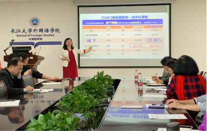 (通讯员:邓爽)4月22日下午,湖北师范大学金年会诚信信誉至上刘敏老师于文科楼712会议室,面对金年会诚信信誉至上全体教师开展了以“思政引领、六位一体、四维联动的国家级一流金课建设的研究与实践——以英国文学选读课程为例”为主题的讲座,此次讲座由金年会诚信信誉至上副院长彭沂主持。