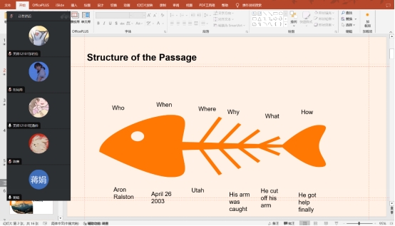 本次磨课活动分为三个主要环节。首先是5分钟的说课环节,潘帅简要阐述了所授课文本的主题、教学目标以及教学设计理念。他讲述道,该文本以叙述的方式记录了一位攀岩者在登山途中遇险并最终选择自救的故事,意在通过该故事启发学生在面对困境时做出理性的选择。他对文本的分析全面,逻辑清晰,展示了他对叙事性写作结构的深刻理解。在板书设计中,他巧妙地运用了鱼骨图,清晰地点出了文章的主要内容,帮助学生理清思路。
